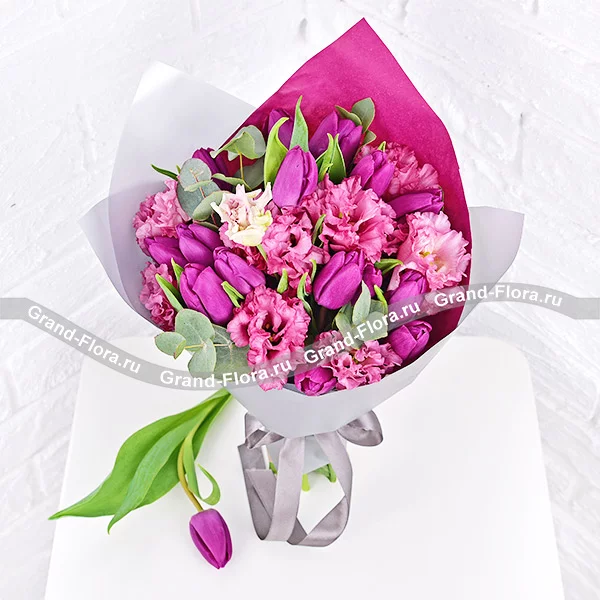 Стандартный: тюльпан фиолетовый - 15 шт., эустома розовая - 10 шт., упаковка, лента.